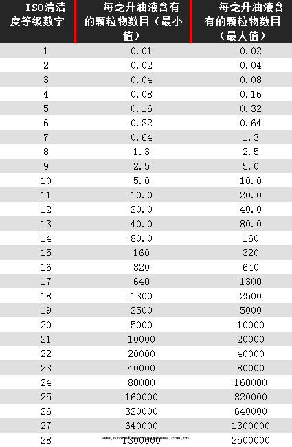 ISO清(qīng)潔度(dù)等級規定(dìng)了(le)油液應(yìng)該达到(dào)多(duō)干(gàn)淨,每个(gè)油樣(yàng)里(lǐ)的(de)颗(kē)粒(lì)物(wù)數量(liàng)不(bù)同(tóng),根(gēn)據(jù)檢測的(de)颗(kē)粒(lì)物(wù)數量(liàng)在哪个(gè)區(qū)間(jiān),規定(dìng)为(wèi)对(duì)應(yìng)等級,例如(rú)測出(chū)的(de)颗(kē)粒(lì)物(wù)數量(liàng)如(rú)果(guǒ)在80~160个(gè)之(zhī)間(jiān),那(nà)麼(me)記(jì)为(wèi)14。如(rú)果(guǒ)≥6微米(mǐ)的(de)颗(kē)粒(lì)物(wù)數量(liàng)为(wèi)120个(gè)/毫(háo)升(shēng),那(nà)麼(me)清(qīng)潔度(dù)等級为(wèi)ISO */14 /*。反(fǎn)过(guò)来,知道(dào)ISO清(qīng)潔度(dù)等級,那(nà)麼(me)就(jiù)可(kě)以(yǐ)算出(chū)颗(kē)粒(lì)物(wù)的(de)數量(liàng)應(yìng)該是(shì)多(duō)少(shǎo)。